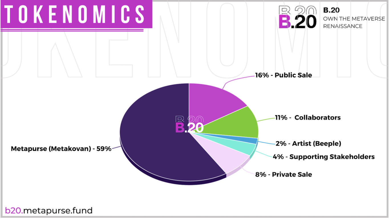 Twobadour Pannar在1月发布的文章提到,B.20(Beeple 20 Collection)代币的总供应量为10000000枚,将大约59%的B.20留给Metapurse,41%的代币给艺术家等参与者分配。其中,16%的代币用于公募;11%给合作者;8%预留给私募;4%留给Metapurse的朋友们;Beeple本人将获得2%的份额。