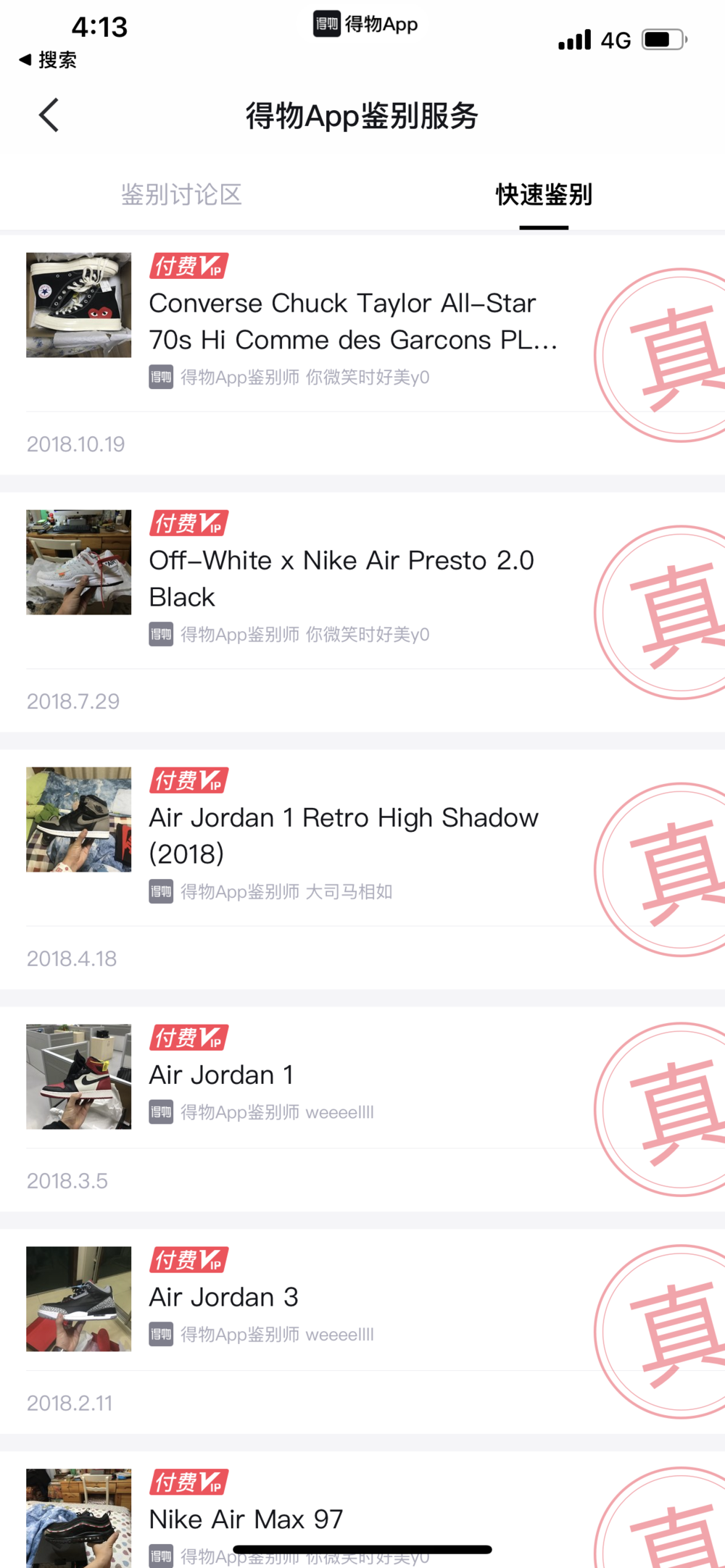 事情发展到现在,各个世代的人殊途同归:就像家里长辈在给你展现玉石玛瑙工艺品之前,总会先给你看收藏证书那般,当代年轻人也对由各种潮品鉴定中心(得物、nice、stockx)出具的鉴定证书、防盗扣、专用盒子和胶带(俗称四件套)附魔组成的结果充满痴信。