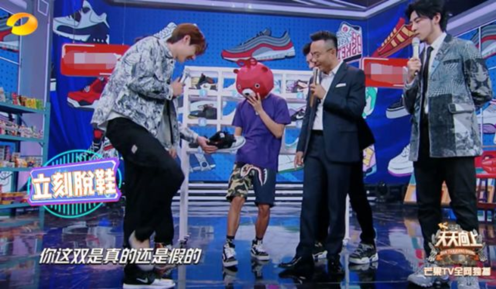 王一博在天天向上里被质疑球鞋是假的,现场立刻脱鞋交给鉴定师鉴定。