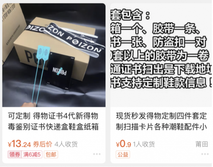 久而久之,人们发现绕过平台规则显得艰难,因此他们退而求其次,选择掩耳盗铃,选择用买来伪造的四件套,将自己真伪存疑的球鞋包裹进去,换得一丝窃喜。