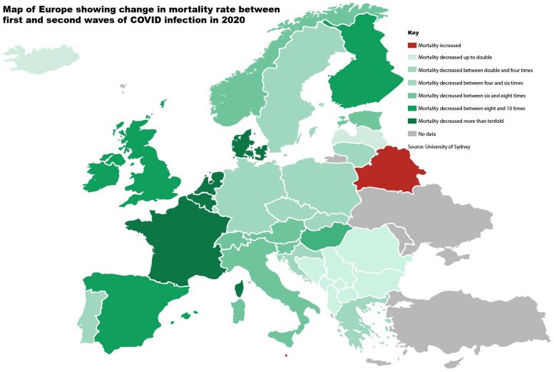地图描绘的数据显示了2020年第一波和第二波COVID感染之间欧洲国家COVID-19死亡率的变化。资料来源:悉尼大学