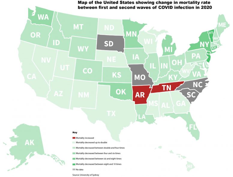 研究数据的地图表示,显示了美国各州从第一波到第二波COVID-19感染期的死亡率变化情况。资料来源:悉尼大学