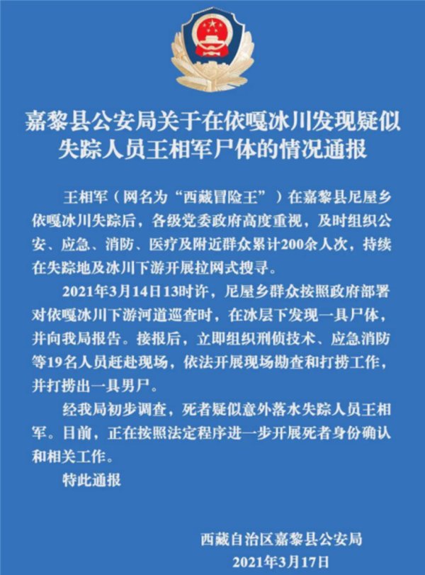 据官方通报显示:王相军(网名为“西藏冒险王”)在嘉黎县尼屋乡依嘎冰川失踪后,各级党委政府高度重视,及时组织公安、应急、消防、医疗及附近群众累计200余人次,持续在失踪地及冰川下游开展拉网式搜寻。