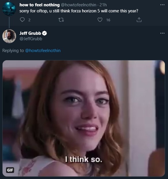 Grubb去年宣称《地平线5》被安排在废渣新作之前面市,比如2021年。有人追问此事,Grubb再次确认《地平线5》年内面市: