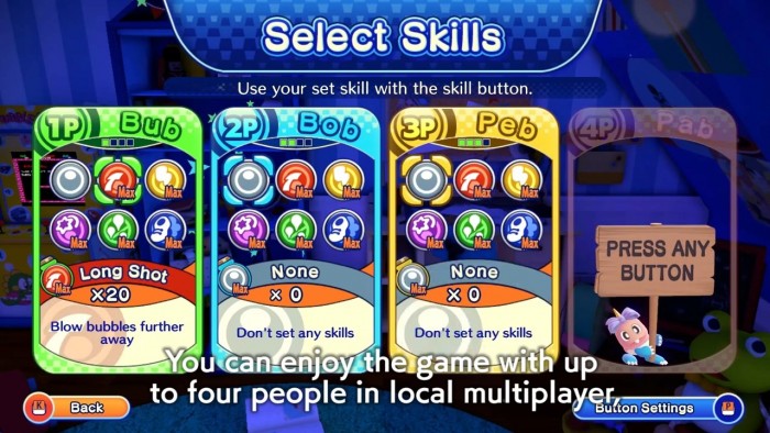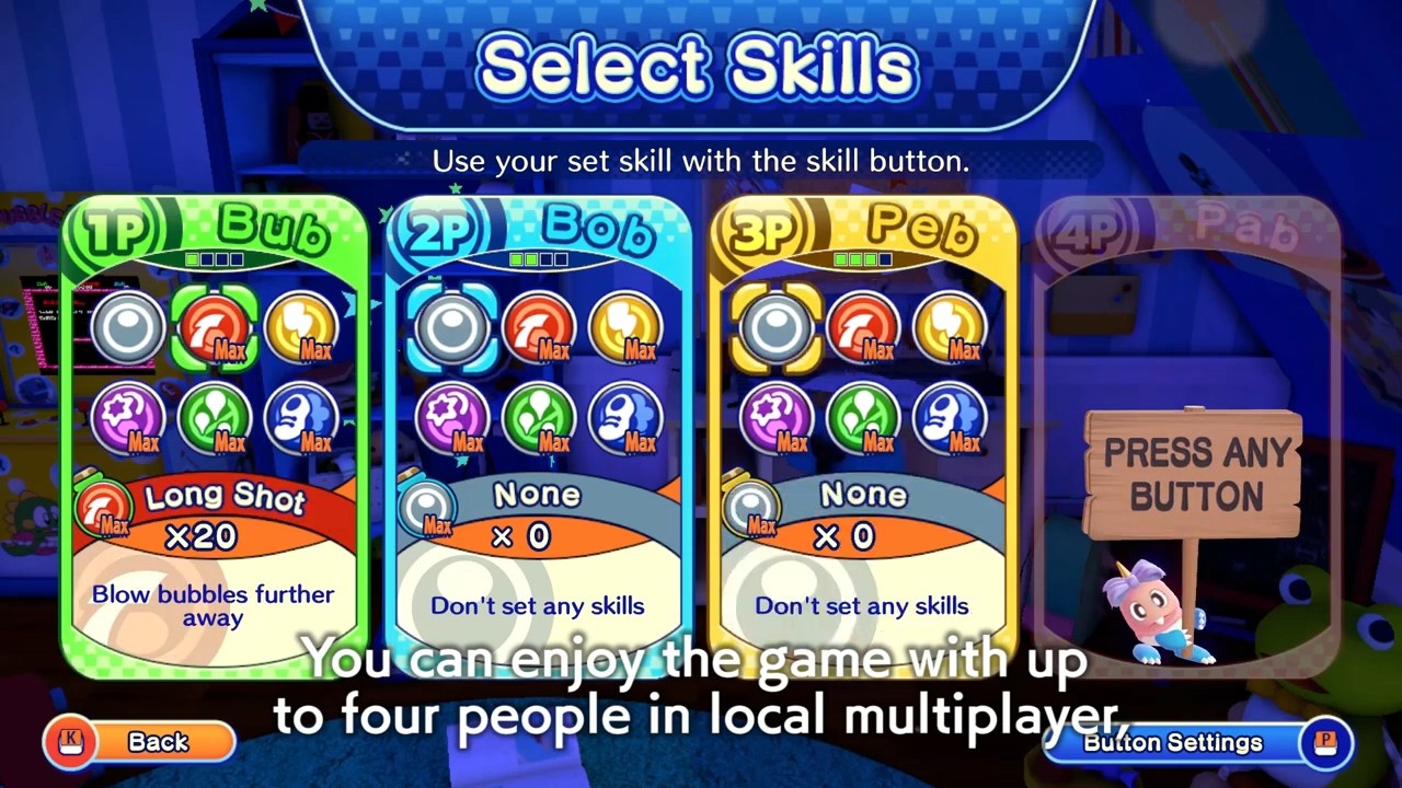 据《泡泡龙4伙伴》制作人Tsuyoshi Tozaki介绍,登陆Steam的PC版《泡泡龙4伙伴》包含之前发售的Switch和PS4版《泡泡龙4伙伴:骷髅阿怪的反击! 》全部内容,游戏支持使用键鼠、手柄进行最多四人游戏。