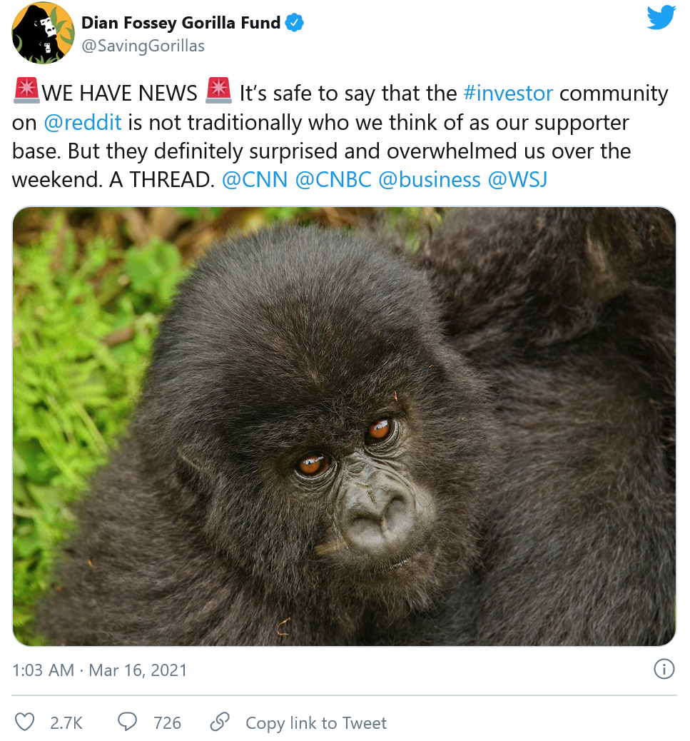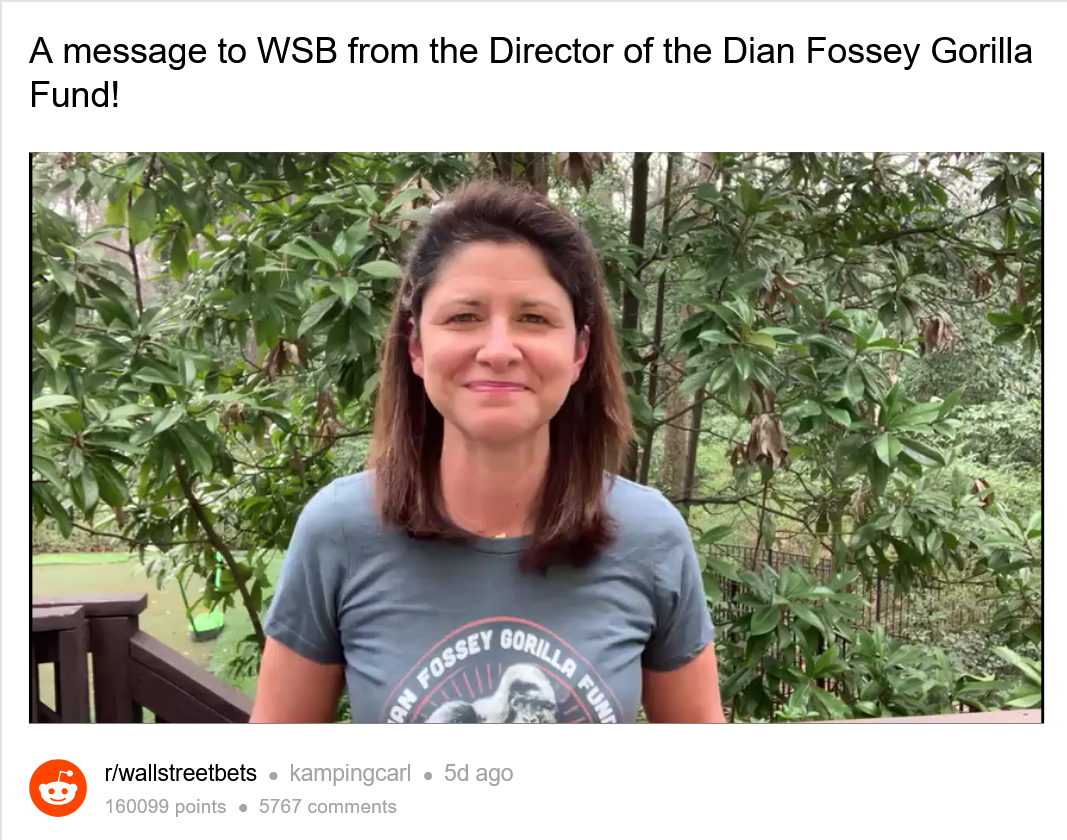 据外媒报道,Apes together strong是Reddit的r/WallStreetBets社区的座右铭之一。现在,这个财经版块的成员们正在利用他们最喜欢的一个表情包向支持野生大猩猩的慈善机构捐赠数十万美元。Dian Fossey大猩猩基金会是reddit用户慷慨捐赠的最突出受益者,该基金会的总裁兼CEO Tara Stoinski将其描述为“世界上最大、运行时间最长、完全致力于大猩猩保护的组织。”