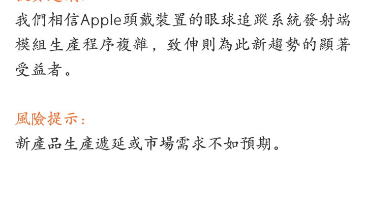 据天风国际郭明錤,Apple头戴装置预计将配备眼球追踪系统,此系统包括发射端与接收端,可侦测与取得眼球移动信息,再根据算法提供用户影像/图像/信息。发射端模块独家供货商致伸为此趋势的主要受益者。