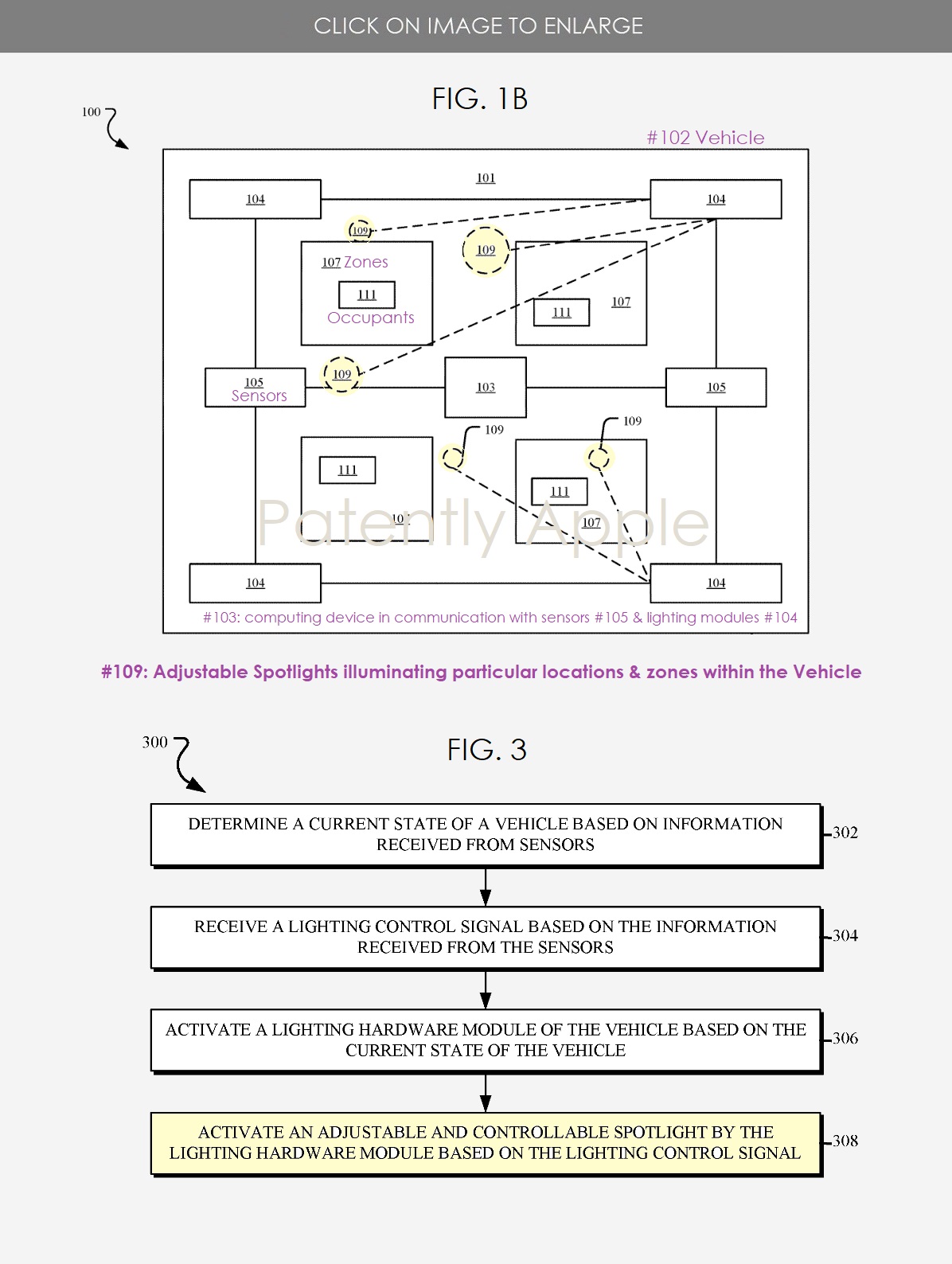 该专利所强调的一个更新颖、更雄心勃勃的使用场景是,如果传感器检测到有乘客睡着了,聚光灯就会打开。如果5级自动驾驶变得普遍,苹果写道,这种类型的功能可以用来帮助在到达目的地后唤醒司机。