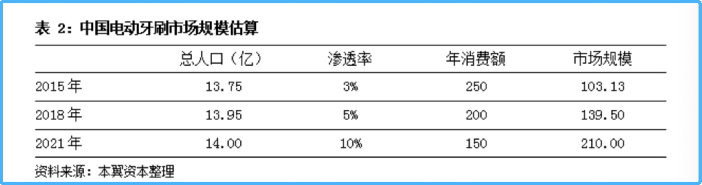 放眼全行业,本翼资本估算,2018年中国电动牙刷的市场规模约为139.5亿元,若到2021年市场渗透率提高至10%,则中国电动牙刷的市场规模将会增长到210亿元。