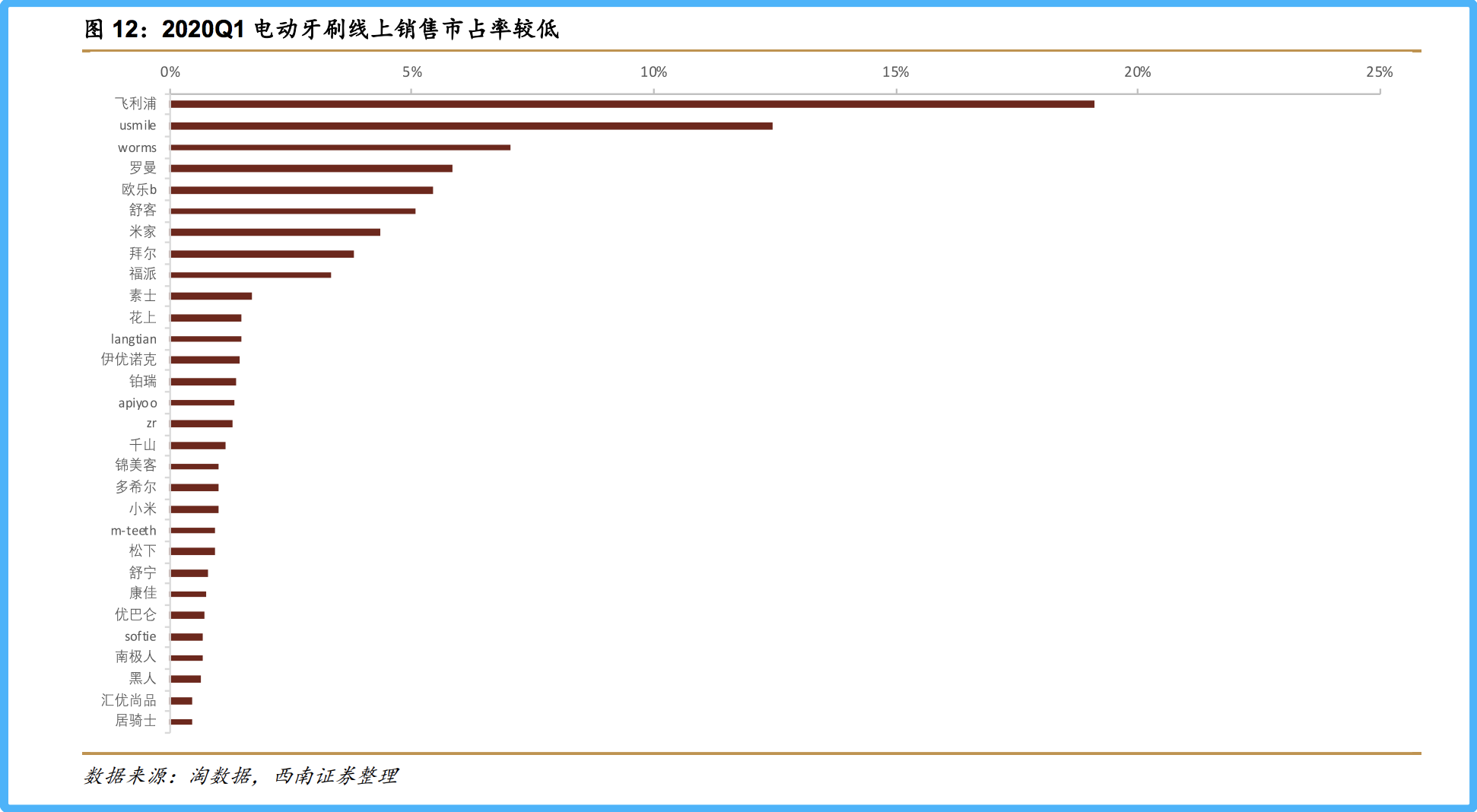 西南证券报告显示,2020年一季度,飞利浦虽然位列电动牙刷线上销售市占率冠军,但占比已经不到20%,而欧乐B更是被usmile、罗曼等品牌超越,仅排第五名。报告称,目前飞利浦和欧乐B虽然基本垄断高端电动牙刷市场,但中低端市场表现不佳,市场竞品多、竞争较为激烈。