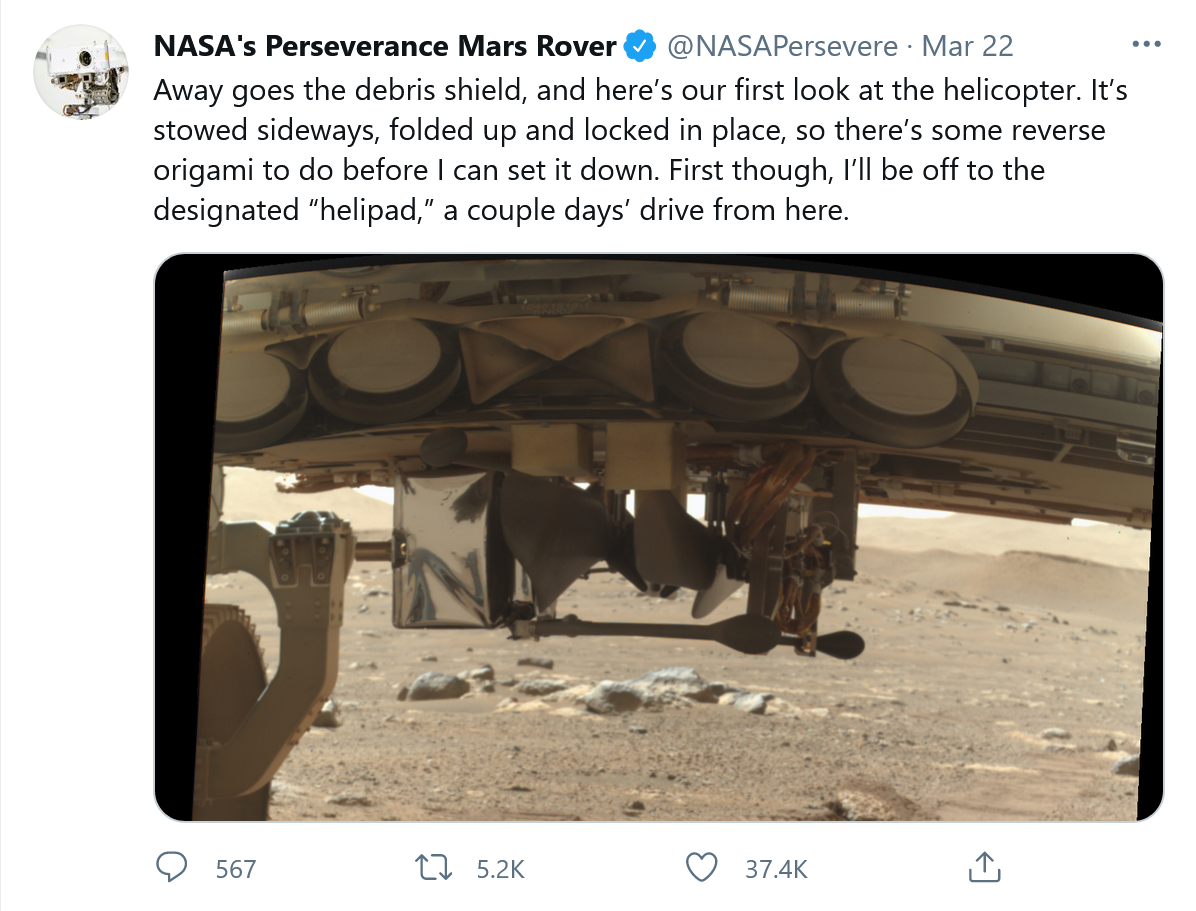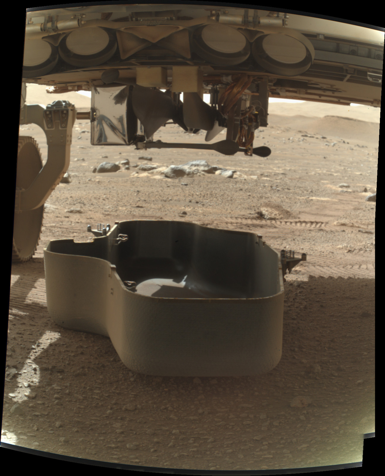据外媒报道,NASA的“毅力号”探测器正在尽其努力帮助实现在火星上进行的首次动力受控飞行。探测器的同伴--Ingenuity将很快在火星起飞。日前,NASA在探测器的腹部卸下了一个保护罩后首次分享了这架小直升机的照片。这张图像由来自安装在探测器机械臂末端的摄像机拍摄。
