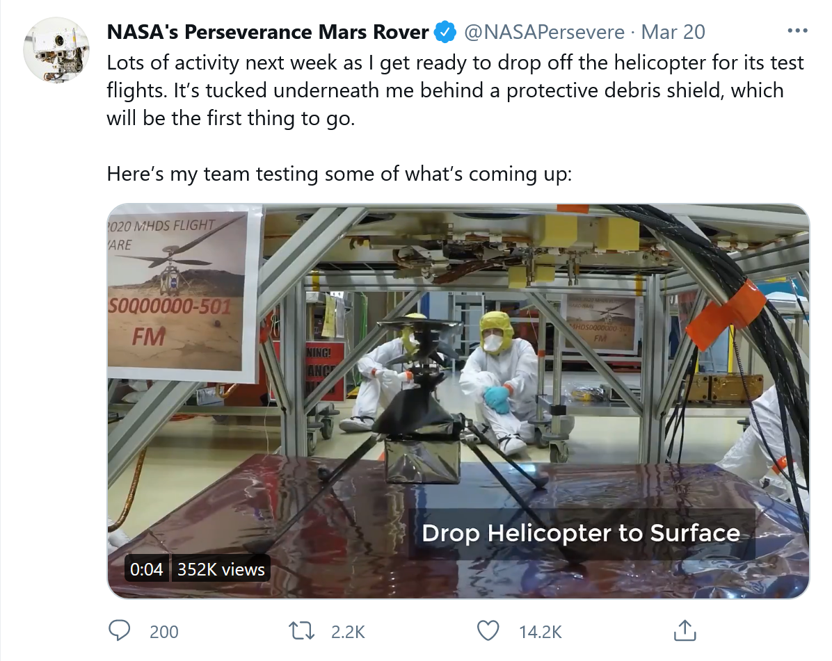 NASA将于当地时间周二的简报会上分享更多关于Ingenuity部署程序和计划的细节。该直升机被认为是一种高风险、高回报的技术演示。如果成功了,那将是惊人的,但如果失败了也不足为奇。