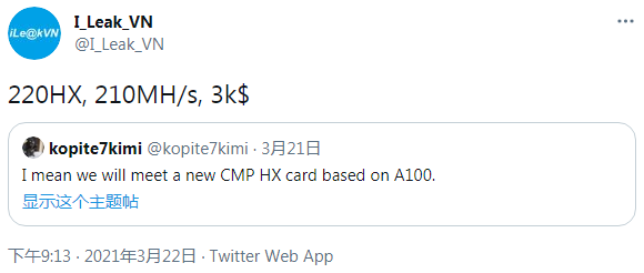 几天前,有报道称英伟达可能会推出基于 Ampere A100 旗舰 GPU 的加密货币挖矿专用卡。据说该 GPU 将成为迄今为止最强大的 CMP 芯片,但外界对其规格和性能数据仍然不太了解。有趣的是,@I_Leak_VN 刚刚在 Twitter 上分享了一则传闻,宣称 CMP 220HX 的算力竟然高达 210 MH/s,且售价可能高达 3000 美元。