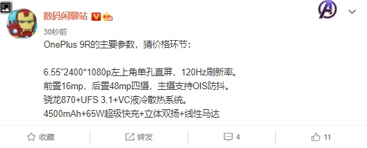 爆料显示,一加9R将搭载高通次旗舰处理器骁龙870,同时还将配备UFS 3.1内存规格+VC液冷散热系统,能提供极为出色的性能表现,并不会比一加9标准版逊色太多。