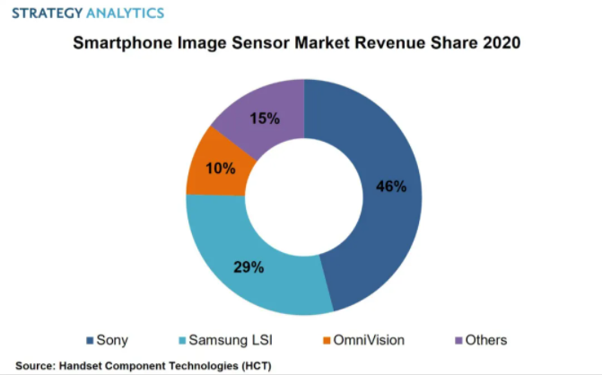 2020年,索尼以46%的收益份额成为智能手机图像传感器市场的第一名,紧随其后的是三星LSI和OmniVision Technologies(豪威科技),两家份额分别为29%和10%。