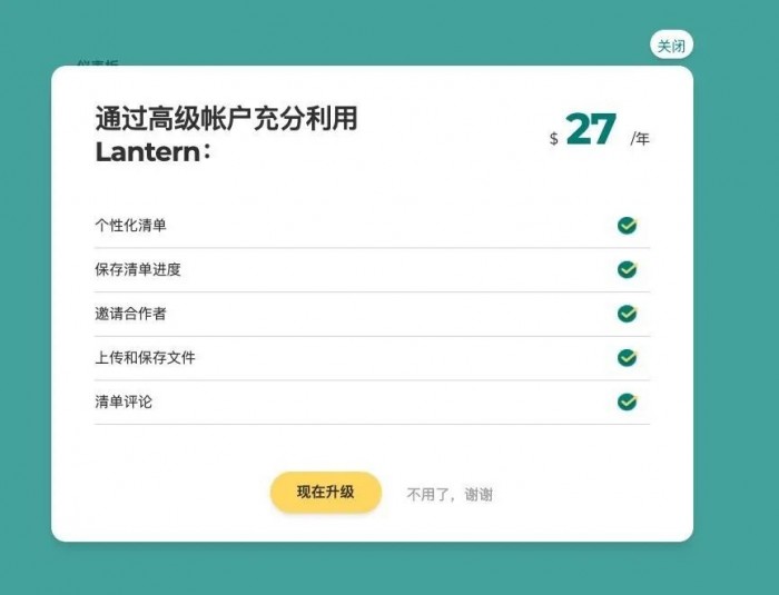 为了让用户更容易接受,Lantern 的服务分为免费版和进阶版。进阶版账户具有更丰富的个性化清单定制功能,以及更大的云存储空间等权益,价格 27 美元一年。