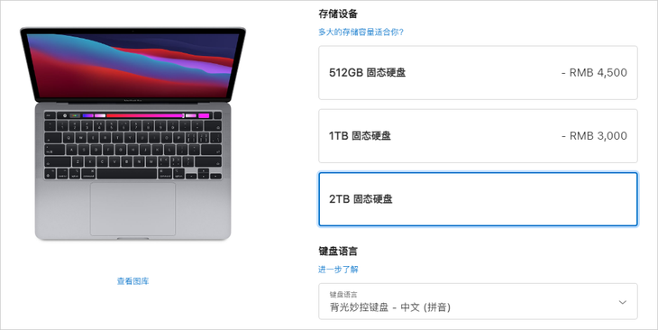 笔者上苹果官网查了查,以苹果MacBook Pro机型为例,从512GB固态硬盘升级至2TB固态硬盘,足足要加价4500块钱,实在是好家伙!
