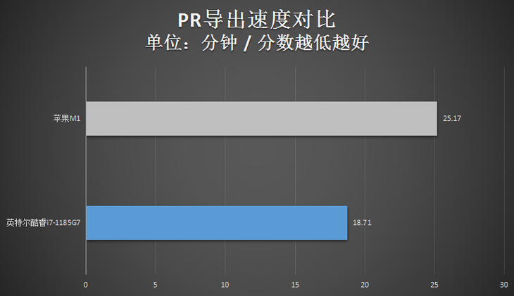 导出一段1080p画质、60帧/秒帧速率、长度达11分钟的H.264编码的视频。最终,苹果M1要比英特尔酷睿i7-1185G7慢了不少。
