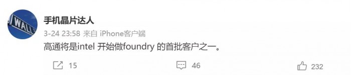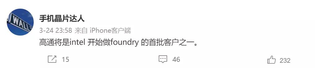 根据微博 @手机晶片达人 的爆料,高通就会是英特尔代工厂的首批客户之一。