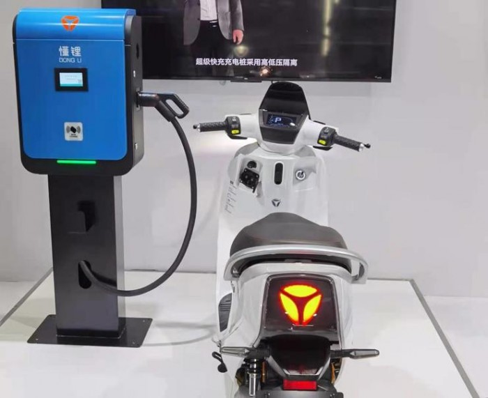 在雅迪创新中心,雅迪还特别展示了超级快充充电桩,通过该充电桩给雅迪电动车充电,从20%充电到85%仅需要5分钟。