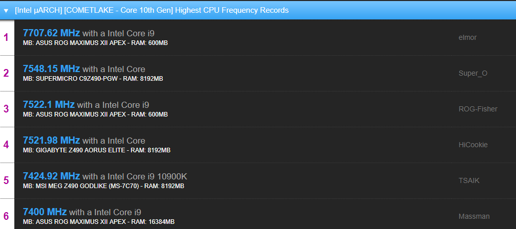 不过酷睿i9-11900K的7GHz超频纪录还不是终点,酷睿i9-10900K的最高纪录是7707MHz,也就是7.7GHz,理论上酷睿i9-11900K要比这个成绩更高才行,不知道最终能否冲击7.8GHz,尽管这很难,因为Intel的处理器外频几乎只能在100MHz左右徘徊,只能拉倍频了。