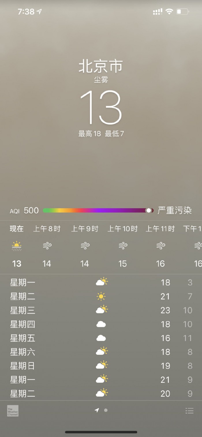 正如此前预告,新一轮的大范围沙尘天气来袭。在昨日抵达内蒙古后,据@气象北京 消息,早晨4点,沙尘和大风已进入北京西部,5点城区西部听见风声了。按照@中国天气 的说法,这是北京今年3月以来的第二次沙尘暴天气,强沙尘持续时间将超过12小时。预计今天入夜后,沙尘天气将逐渐减弱,空气质量转好。