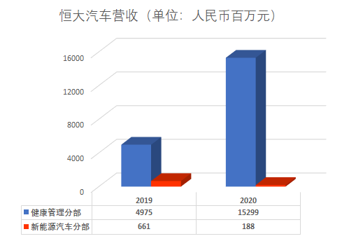 也因此,虽然名字是“恒大汽车”,但实际有两大业务,一个自然就是现在主打的新能源汽车分部(在中国及其他国家从事新能源汽车科技研发、生产和销售),另一个则是“继承”自恒大健康的健康管理分部(于中国从事“互联网+”社区健康管理、国际医院、养老及康复产业)。值得一提的是,恒大早在2018年6月就通过收购进入了汽车行业,在恒大健康2019年的财报中同样有这两大业务。那么相较2019年,2020年恒大汽车这两大业务有什么变化呢?