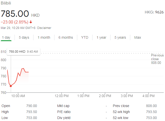 3月29日上午消息,哔哩哔哩(以下简称B站)正式在香港二次上市,股票代码为:9626。上市首日,B站开盘破发,跌2.23%报于790港元,港股市值达2981亿港元。哔哩哔哩此次发行价为808港元/股。