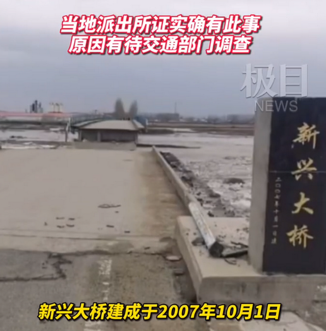 近日,有网友在社交网络上晒出视频称,哈尔滨方正县新兴大桥出现垮塌,疑为冰排撞击导致。据介绍,新兴大桥建成于2007年10月1日,这座桥有双向两车道。从居民上传的视频上看,其中一段桥面完全垮塌,出现数十米长的空缺,桥下水面上有许多的冰排流过。