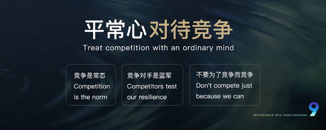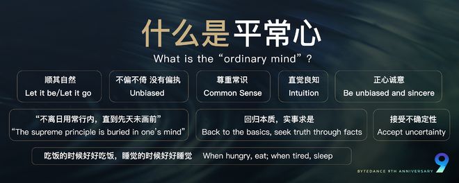 张一鸣分享了他对于“平常心”的思考:如何以平常心对待自身、公司业务、行业竞争、成功和失败。张一鸣表示,世界在动态加速变化,外部波澜起伏,内心要保持平静如常。要以平常心对待自身、产品业务、行业竞争、成功和失败,“以平常心做非常事”。