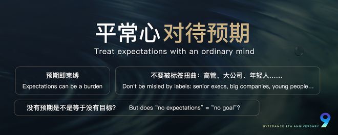 有一种说法是说,如果你把自己当做客体,就能有更平常心的状态,公司也是如此。现在外部有很多对于我们公司的归纳总结,我觉得是叫“字节成功学”吧,都很有问题。我尽量不看。我们不要反过来被外部评价定义和影响,应该基于自己提更高的标准。
