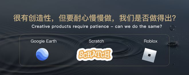 我这里贴了三个产品,它们都做得很好,一个是Google Earth,我经常用它来学地理,这个产品很伟大但不赚钱。Scratch,儿童编程,赚不赚钱我不知道,但也很伟大。Roblox,一种UGC的沙盒游戏,跟我们平时说的游戏非常不一样。