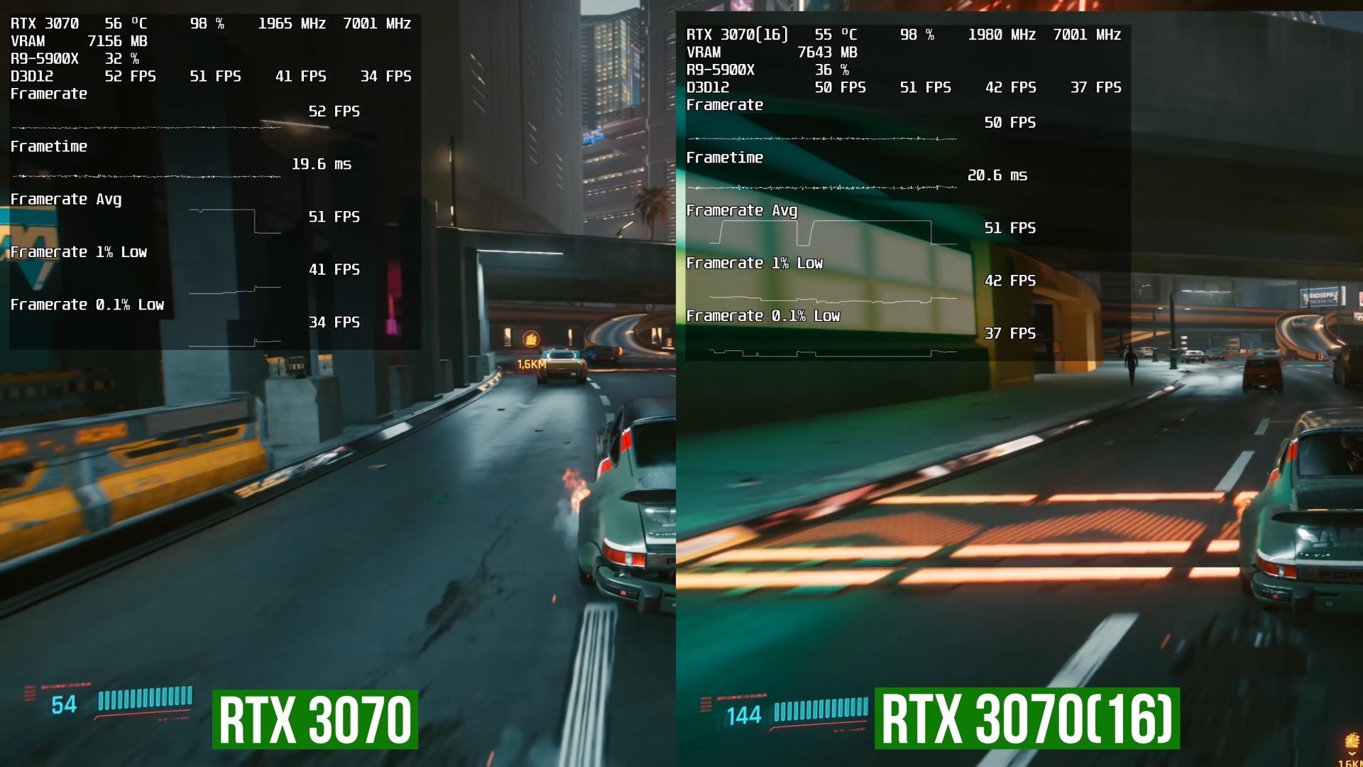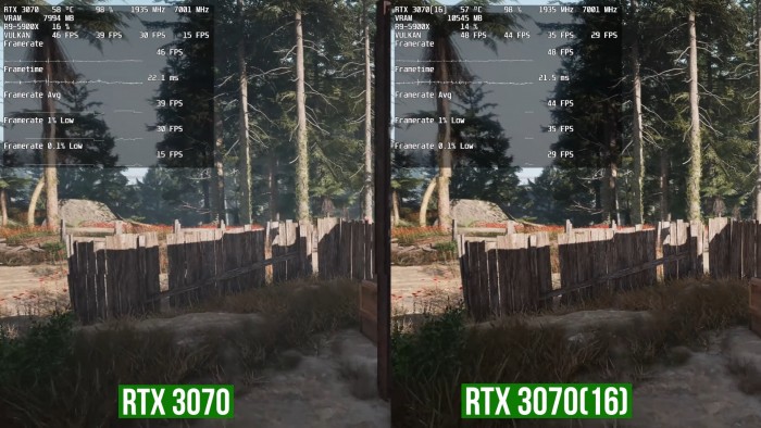 理论上,16GB显存可以让RTX 3070有更充裕的空间存放高分辨率纹理,光追游戏中也能保存更多数据,实际上也确实如此。