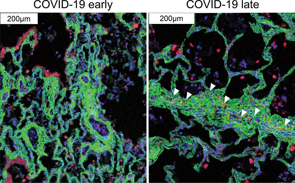 由威尔康奈尔医学和纽约长老会的研究人员领导的一个团队利用先进的技术和分析方法,以单细胞分辨率绘制了严重COVID-19和其他感染性肺部疾病中病变肺组织的细胞景象。在2021年3月29日在线发表在《自然》杂志上的研究中,研究人员对尸检的肺组织进行成像,同时突出了细胞上的几十个分子标记。
