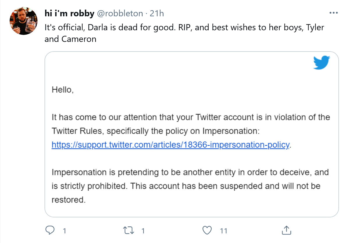 Appleton提供了各种证据来支持这一说法,其中包括两封来自Twitter的电子邮件。第一封邮件显示了Twitter对他要求恢复该账号的回应,另一封来自Twitter的电子邮件则确认了其一个账号因违反了该平台关于“假冒”的规定而被永久封号。