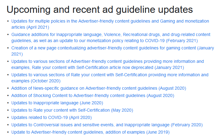 最大的变化是在第一部分出现了一个新的要点,涵盖了可以打开广告的视频。现在,这涵盖了专注于 "购买、制造或分销药物,如自制药物 "的视频,以及例如不美化滥用药品的 "关于种植农场的新闻报道"。此前,广告商必须选择针对这类内容投放广告,限制了他们的广告收入。