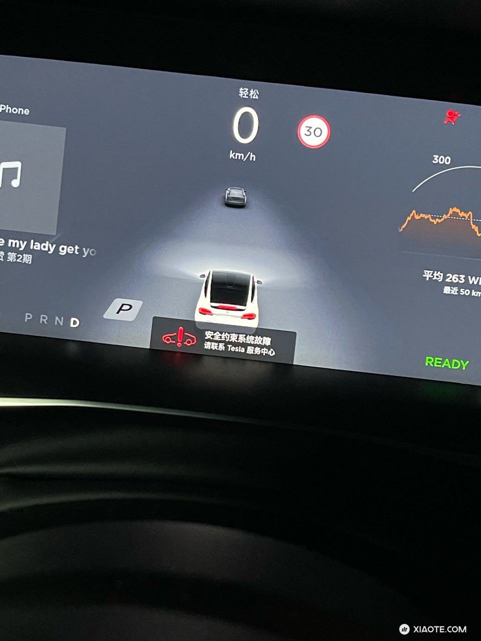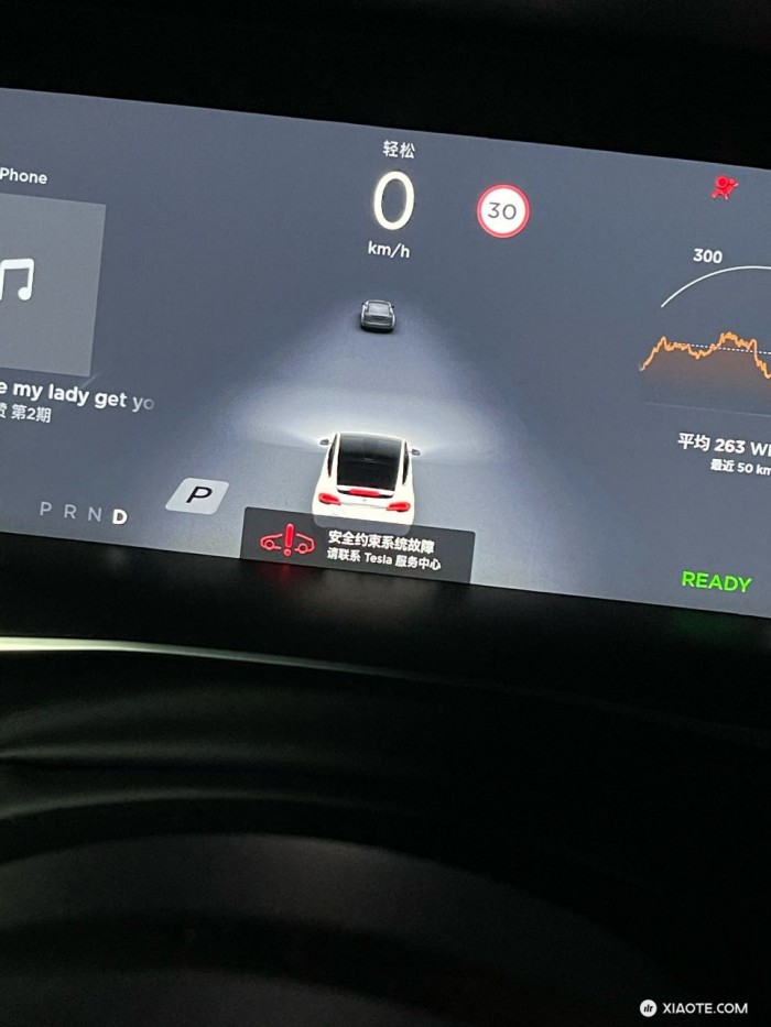 同时,驾驶屏幕显示安全约束系统故障,气囊红灯亮起,导致车辆偏离正常行驶道路冲向路牙,踩刹车停下,挂P档再挂D档,尝试把方向回正。