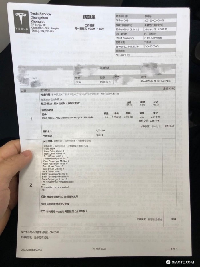 随后车主前往所在地常州钟楼特斯拉中心进行检修,经检查售后人员告知我转向柱模块损坏,需更换。