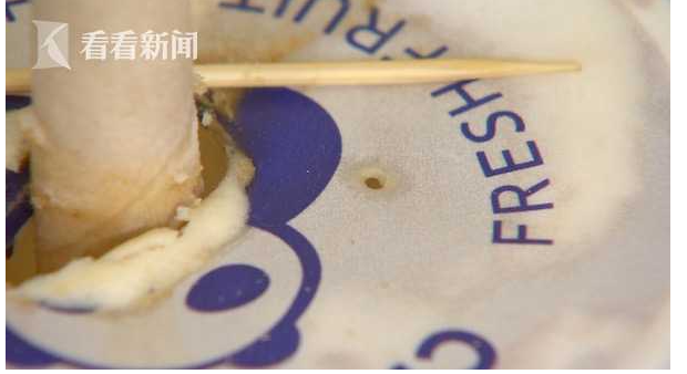 庞女士回忆,当天,"饿了么"骑手将这三杯奶茶送到时,装奶茶的提袋并未封口。发现牙签后,庞女士仔细查看了奶茶外包装,杯子的封盖上面有一个比较小的洞。