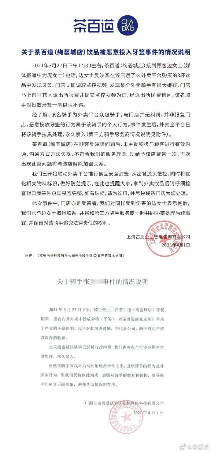 据茶百道官微消息,对于今日网络上关于茶百道(绚荟城店)饮品被恶意投入牙签事件的情况,经调查取证了解,茶百道上海管理方连同事件中的骑手服务商做出说明,说明称外卖全平台已将该骑手拉黑。