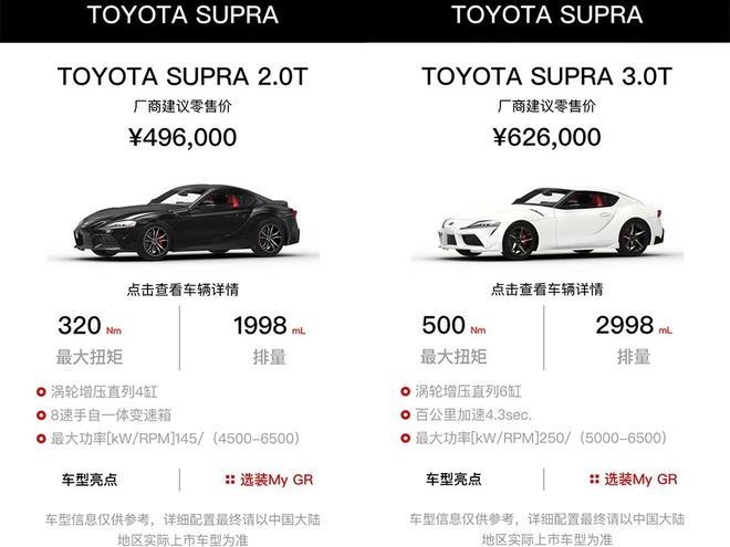 今日,丰田正式发布其运动品牌“GAZOO Racing”旗舰运动车型TOYOTA SUPRA在中国的厂商建议零售价,车型共分为2.0T和3.0T两个款型,厂商建议零售价分别为49.6万元和62.6万元。