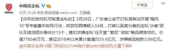 之前我们报道过淘宝下架大量PS5/XSX/NS海外版主机的新闻,这应该与近日的一起走私案有关,一起来看看最新报道吧!据中国反走私官微报道,3月29日广东省公安厅打私局联动开展“飓风18”号专案集中收网行动,抓获犯罪嫌疑人54名,打掉以吴某为首的走私“水客”团伙及揽货团伙等共计13个,查扣涉嫌走私“任天堂”“索尼”“微软”等品牌游戏机、价值7780余万元,查证2018年以来累计案值约33.8亿元、涉嫌偷逃税款3.89亿元。