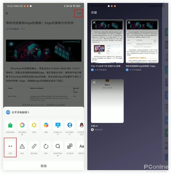 刷到一篇好文章,却没时间看,最好的方法就是点击右上角“…”选择“浮窗”功能。