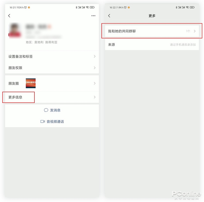 如果你的微信已被重置,也没有像上文那样提前将群保存好,还有一个补救的方法,那就是找到一位同群里的好友,点击TA的头像,在详情页中点击“更多信息”,这里会显示一个“我和TA的共同群聊”子链接。