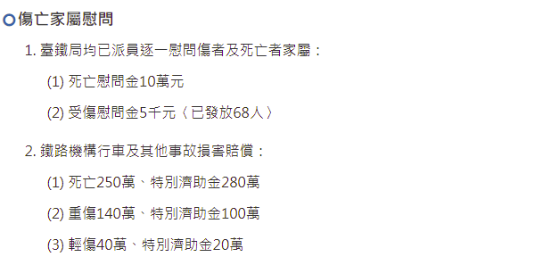 同时,台铁局已派人逐一慰问伤者、遇难者家属,死亡慰问金10万元新台币,受伤慰问金5000元新台币。