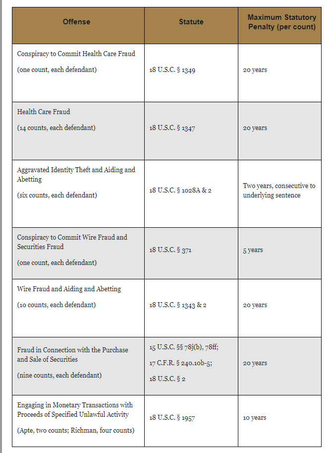美国政府的起诉书包括了证券欺诈、医疗欺诈、洗钱、身份盗用等总计数十项非常严重的罪名。如果最终被判有罪的话,根据硅星人的计算,这些罪名的合计坐牢时间将长达1454年……每人700多年。