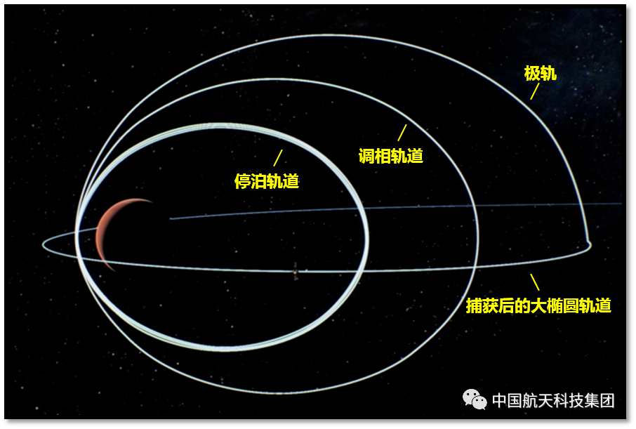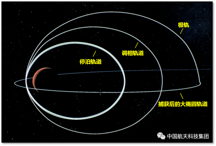 天问一号探测器到达火星后开展了一系列复杂的变轨操作。2021年2月10日,探测器第一次到达近火点时进行捕获制动,成功实现火星环绕,进入周期为10天的大椭圆轨道;2月15日,探测器第一次到达远火点时进行变轨,调整轨道平面与近火点高度,环火轨道变为经过火星南北两极的极轨;2月20日,探测器第二次到达近火点时进行制动,进入周期约为4天的调相轨道,使其在运行一圈再次到达近火点附近时,能够正好经过预定着陆区上空。