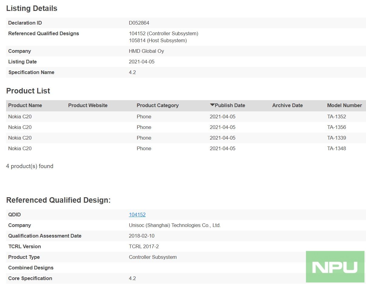 赶在 4 月 8 日官方发布之前,蓝牙认证信息已经揭示了 Nokia C20 的名称、衍生版本、以及来自紫光展锐(Unisoc)的芯片组。目前已知的四款机型代号分别为 TA-1339、TA-1348、TA-1352、以及 TA-1356 。此前,TA-1352 的清单已被俄罗斯分销商给曝光。