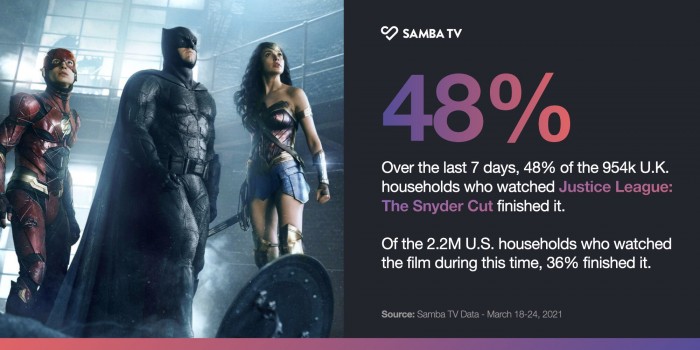 虽然说《正义联盟》导演剪辑版上线后非常火热,但是4个小时的片长也不是所有人都能接受的,据智能电视观众跟踪App和观众汇总软件Samba TV最近发布的数据显示,在美国和英国,观看这部长达4小时的《正义联盟》导演剪辑版的观众中,只有不到一半的人坚持观看整部片子。