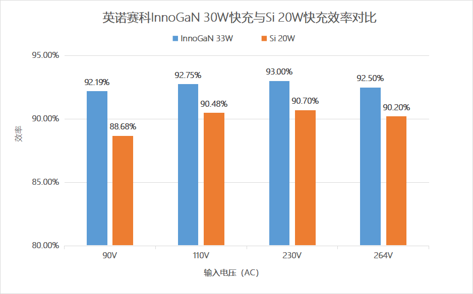 效率方面,英诺赛科33W氮化镓快充方案无论是在90ac、115Vac输入还是230Vac、264Vac输入,其效率均在92%以上,相比目前市面上主流的20W硅方案,效率提升3个百分点。高效率带来的低发热,为实现小体积、高功率密度产品设计保驾护航。